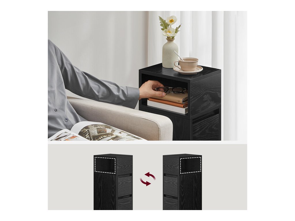 Stolek nabízí dva praktické typy úložného prostoru: otevřenou přihrádku, kde můžete mít uložené knihy, brýle či dekorace, a spodní část schovanou za dvířky, která je ideální pro věci, které chcete mít uklizené, ale stále po ruce. Decentní úchytky ladí s minimalistickým designem a nenápadně doplňují jeho čisté linie.