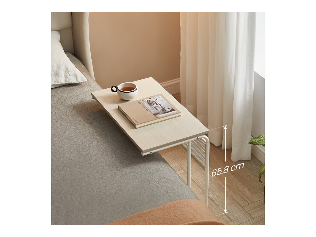 Horní deska i spodní police jsou vyrobeny z MDF v dekoru běleného dubu, který působí elegantně a zároveň útulně. Matný povrch je nenáročný na údržbu a dobře odolává každodennímu používání. Spodní police poskytne další prostor pro uložení knih, časopisů, dekorací nebo drobných předmětů, které chcete mít vždy po ruce.