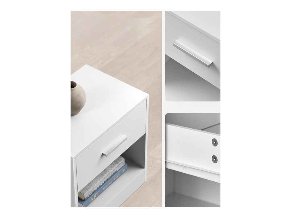 Každý stolek je vybaven praktickou zásuvkou s jednoduchou úchytkou, která poskytne místo na drobnosti, které nechcete nechávat na očích – brýle, nabíječky, kosmetiku či další nezbytnosti. Pod zásuvkou se nachází otevřený úložný prostor, ideální pro knihy, dekorace nebo věci, které potřebujete mít rychle po ruce. Kombinace těchto dvou typů úložných míst zvyšuje praktičnost stolku a zároveň zachovává jeho čistý a minimalistický vzhled.